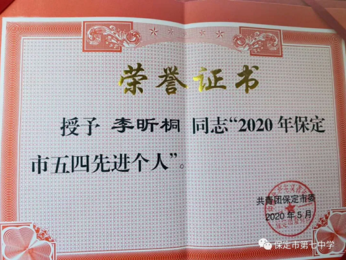 为充分发挥典型示范引领作用,共青团保定市委于“五四”期间开展了“选树 2020 年保定市五四先进典型”活动。经公开投票评选,我校团委副书记李昕桐荣获“2020年保定市五四先进个人”荣誉称号。她还担任了保定市第十三届青联社会科学与教育界别副主任一职,并通过一系列活动,将保定七中青年教师的风采展很好的展现给社会大众。