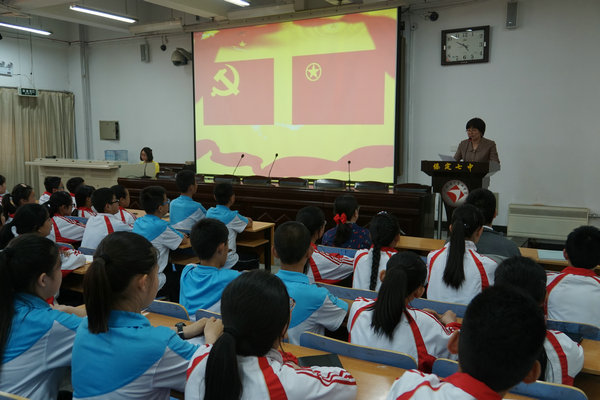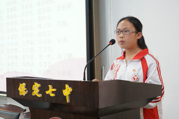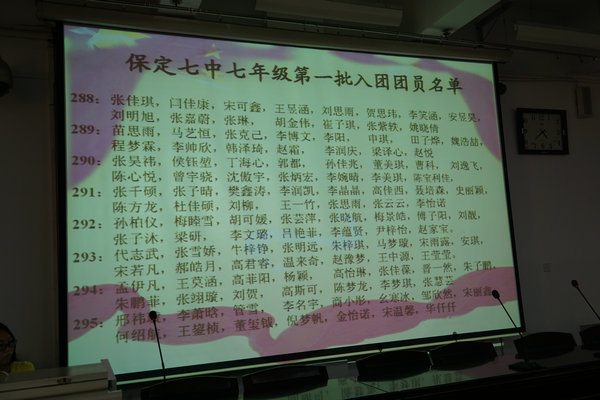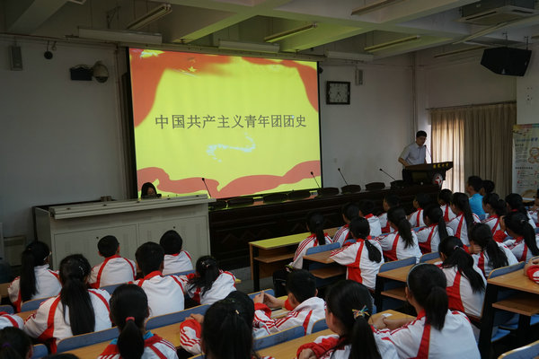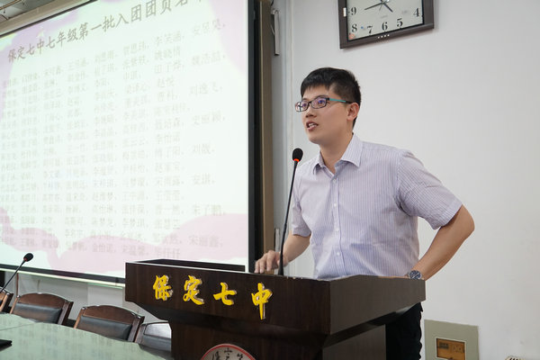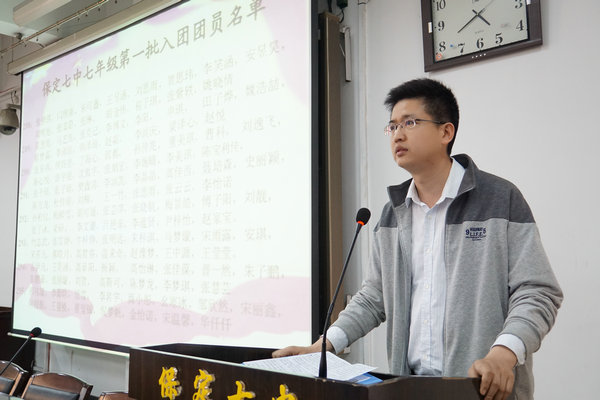加入团组织是每一位青年梦寐以求的夙愿,5月4日,恰逢5.4青年节,保定七中七年级第一批入团仪式在我校阶梯教室举行。屈峥嵘副校长,初中部党支部书记戴静全程参加了本次活动。本次活动由七年级年级科组织和举办,李海静主任负责主要组织工作,于大龙老师任主持人,各班主任及任课老师积极配合协调本次活动。