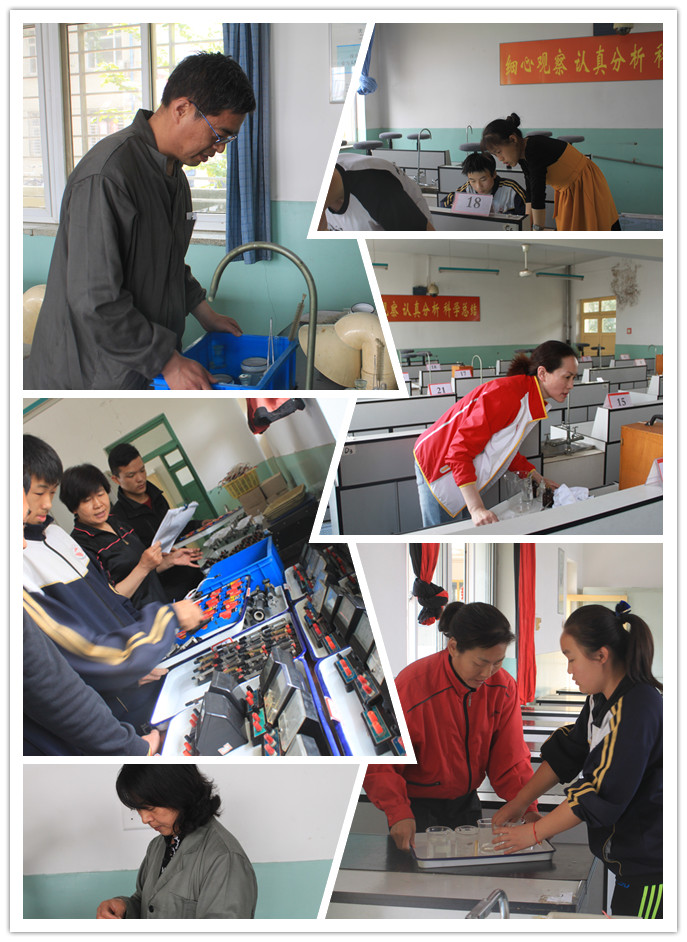 中考实验考试在即,在3月阵阵春雷声中悄然拉开了2014年中考实验练习与测试的序幕。由于我校不同于市区其他四个考点,我们是一所完中,实验室的任务是既要保证我校初三学生练习,又要布置考点进行实验测试,因此任务量十分巨大。从5月5日起到5月9日每位实验教师每日都要进行120套实验器材的收放,同时又要指导学生实验,从精神到体力付出十分巨大。张雄鹰、徐建秀、张淑莲、吴秀君、霍树坤、赵浩杰、朱琴几位老师一趟趟跑试验药品器材商店,一遍遍检查实验器材,有时早过了下班时间,他们还在实验室加班。认真检查测试实验器材:电池是否有电,灯泡亮不亮,化学药品称量,显微镜调试,老师们深信严谨认真才能保证科学实验的成功。为了学生们能考出好成绩,为了中考实验考试在我校能圆满完成,实验室的教师团队克服了无数困难:有的父母孩子生病了顾不上照顾,有的自己病倒了也坚守岗位,有的老师家远中午索性就在办公室休息。