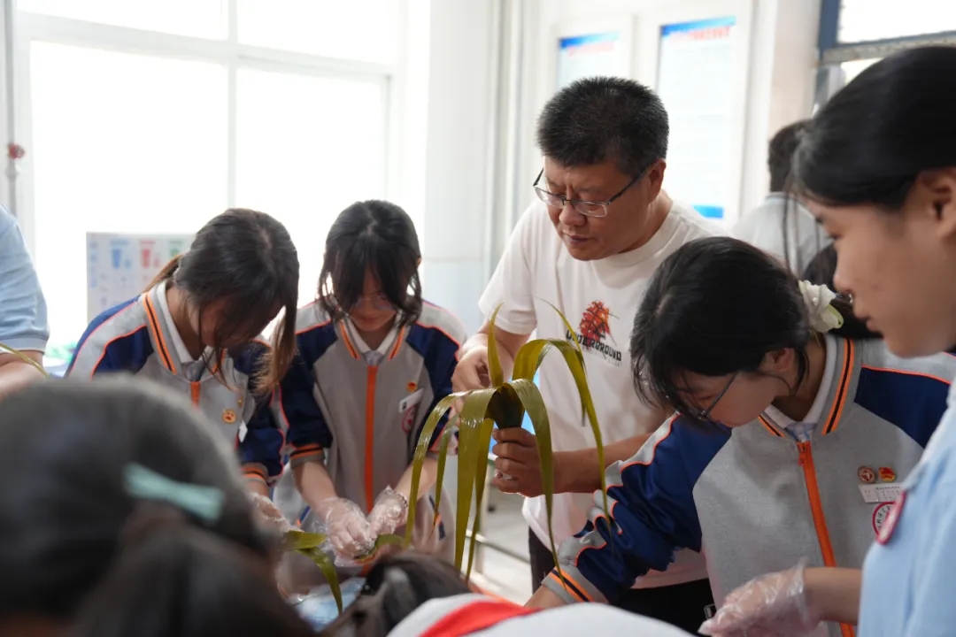 圆锥形后放入糯米、蜜枣,封好后绑上细绳。虽然有些同学动作略显生疏,但他们的热情努力让活动充满了欢声笑语。一片绿叶,一缕清香,